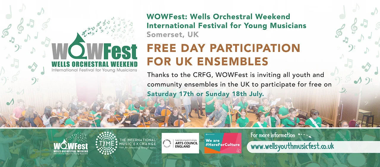 Free participation opportunities Mar 22 Written By Tamsin Smith Courtesy of the CRFG, all UK youth and amateur ensembles are invited to participate in WOWFest 2021 for FREE on Sat 17 or Sun 18 July. Come and join us for a joyful day of music-making, meeting other musicians and discovering the wonder of Wells. Tamsin Smith